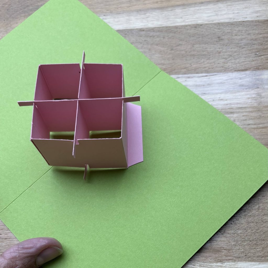 - Pour le fond de carte, découpe un morceau uni de 21×14.85 cm. Plie à 10.5 cm dans les 21 cm.