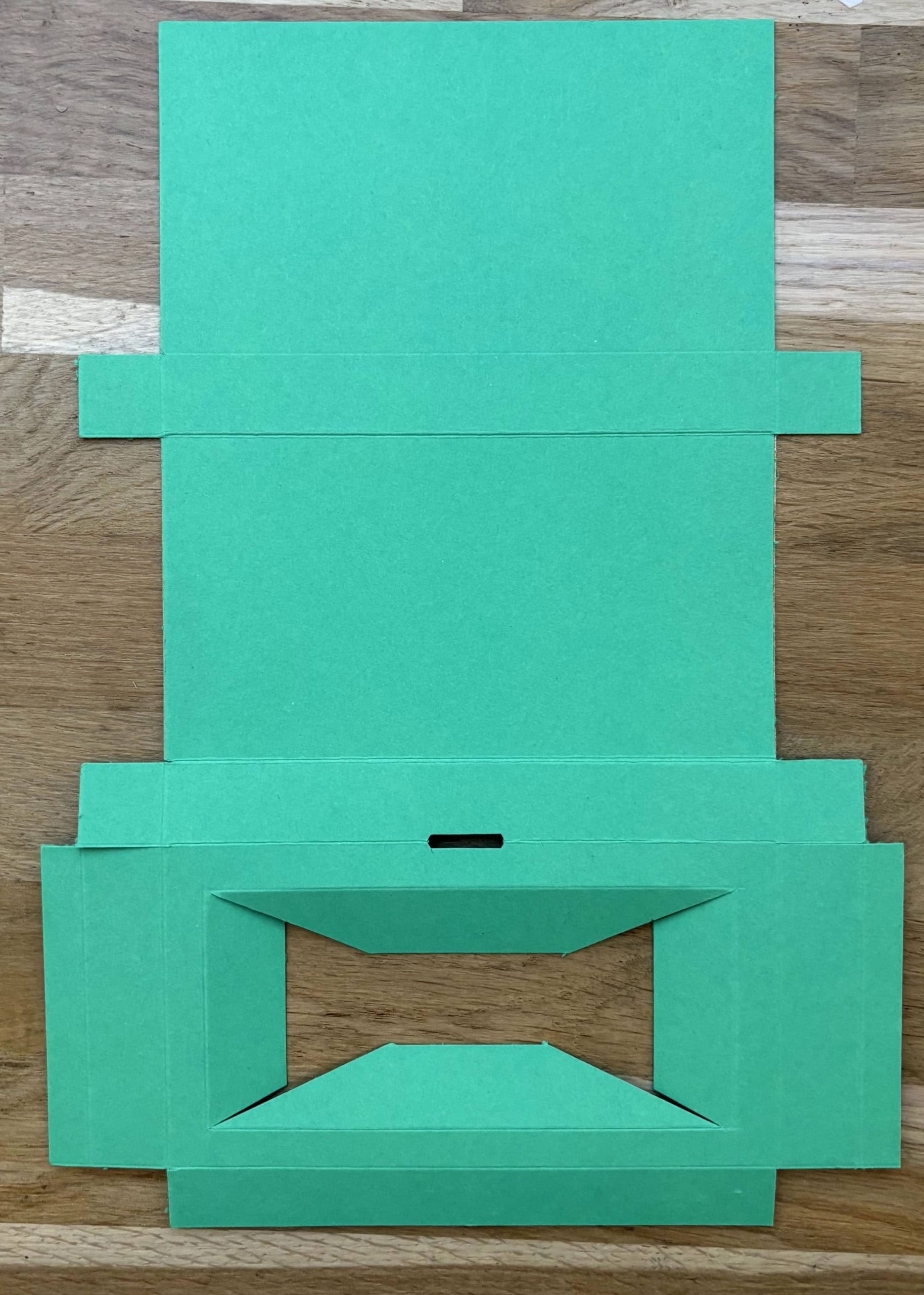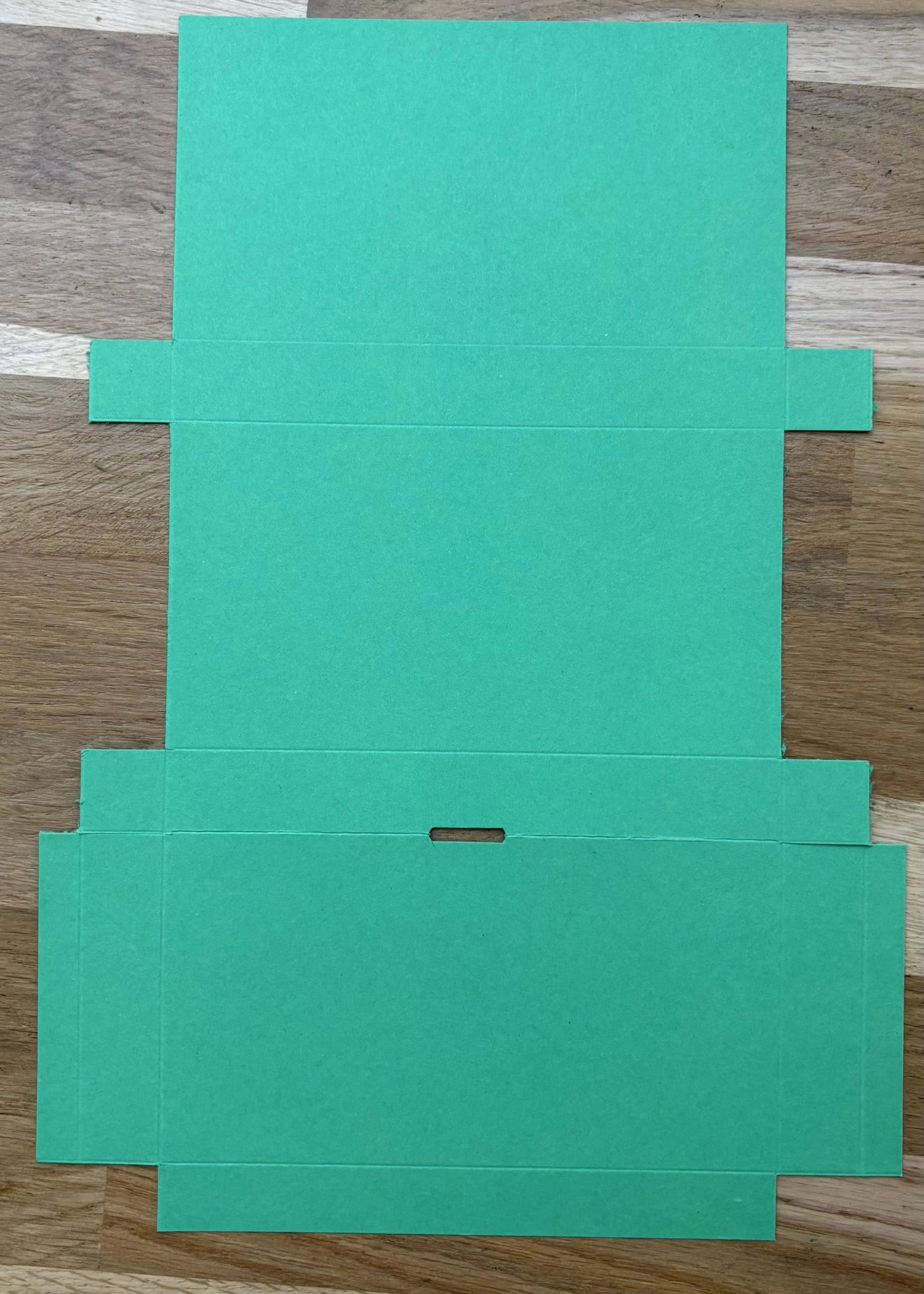 • Suit le schéma pour découper ta feuille et n’oublie pas de créer une fente pour le système de fermeture.