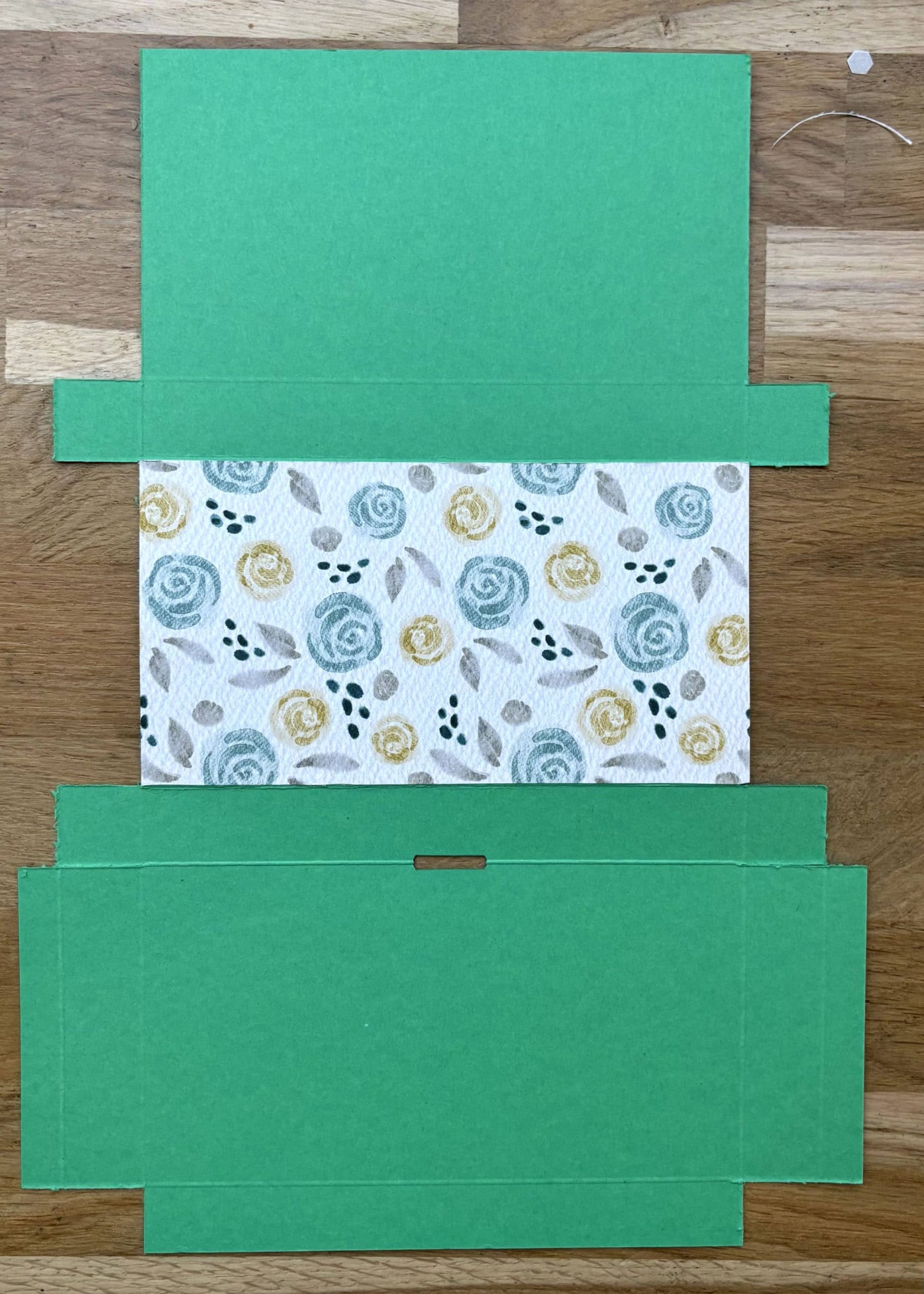 • Colle un morceau de papier à motifs de 15×8 cm dans la partie centrale (au verso). Ce sera le fond de la boîte.