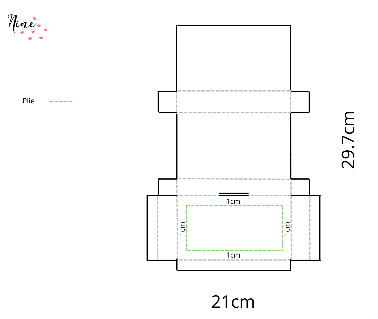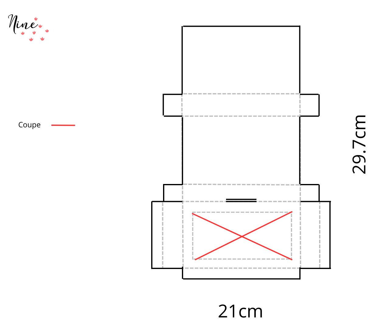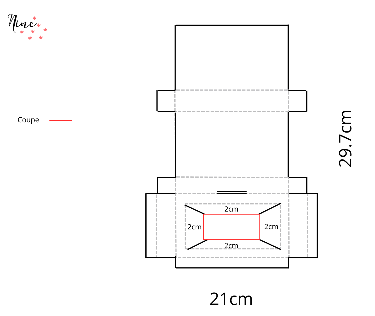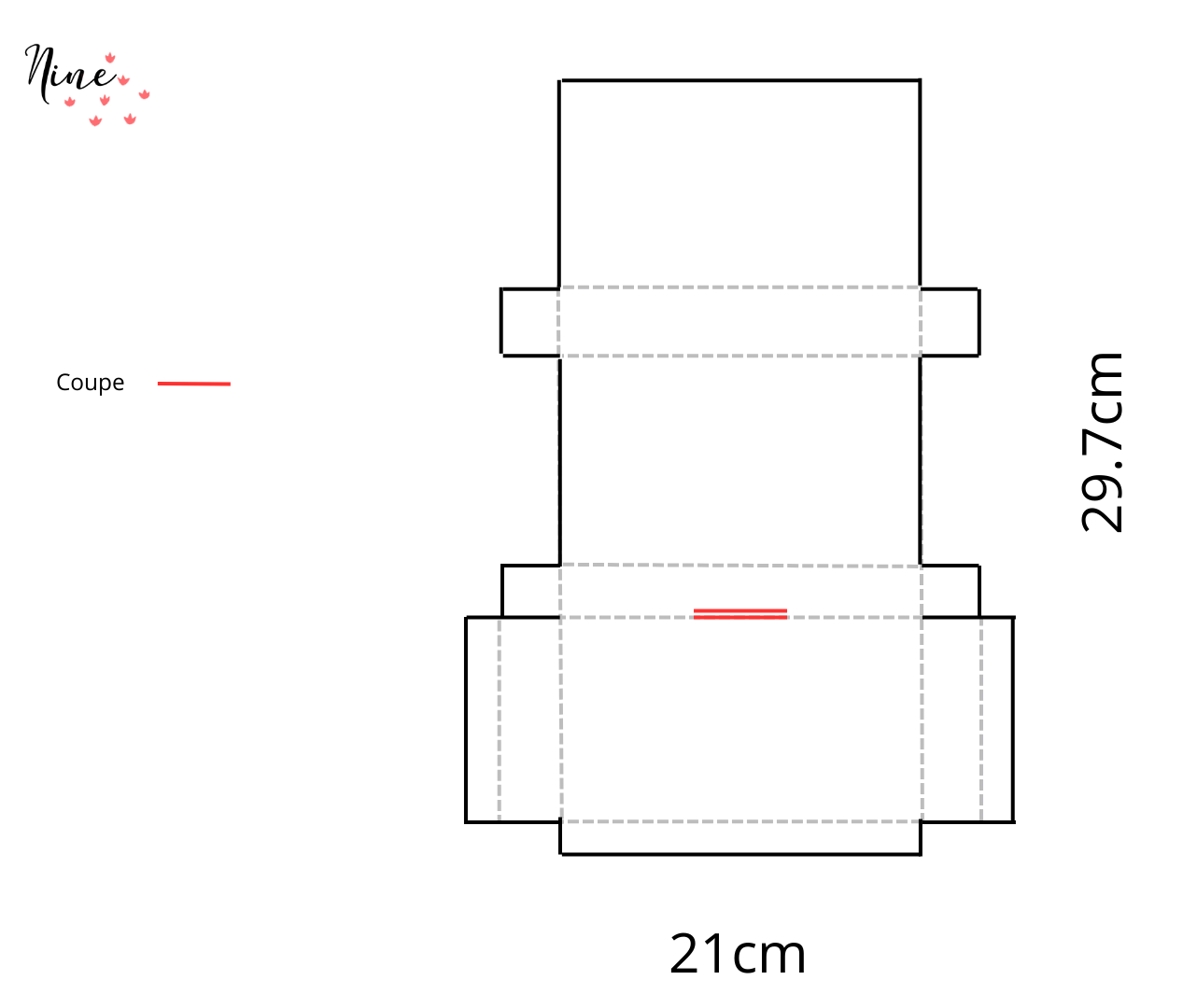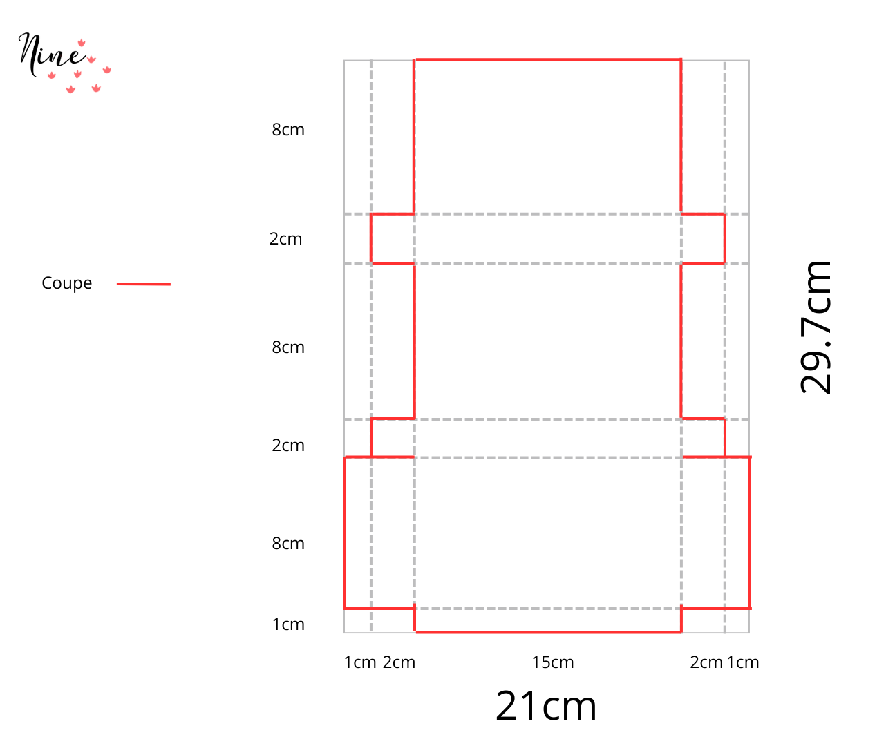 La création de cette boîte s’avère plus simple que tu ne le penses. Voici les mesures et découpes utiles pour créer ta boîte en papier :