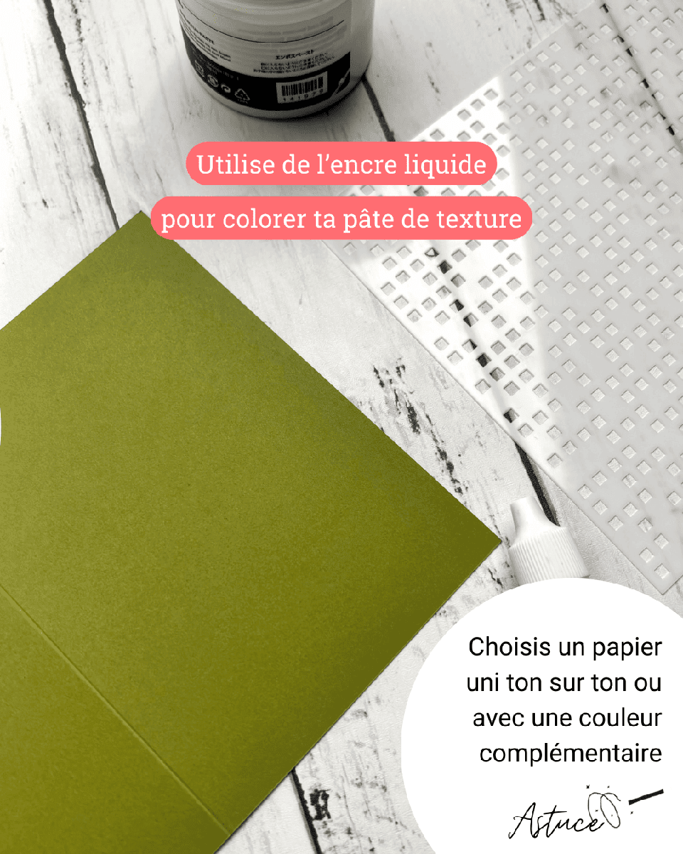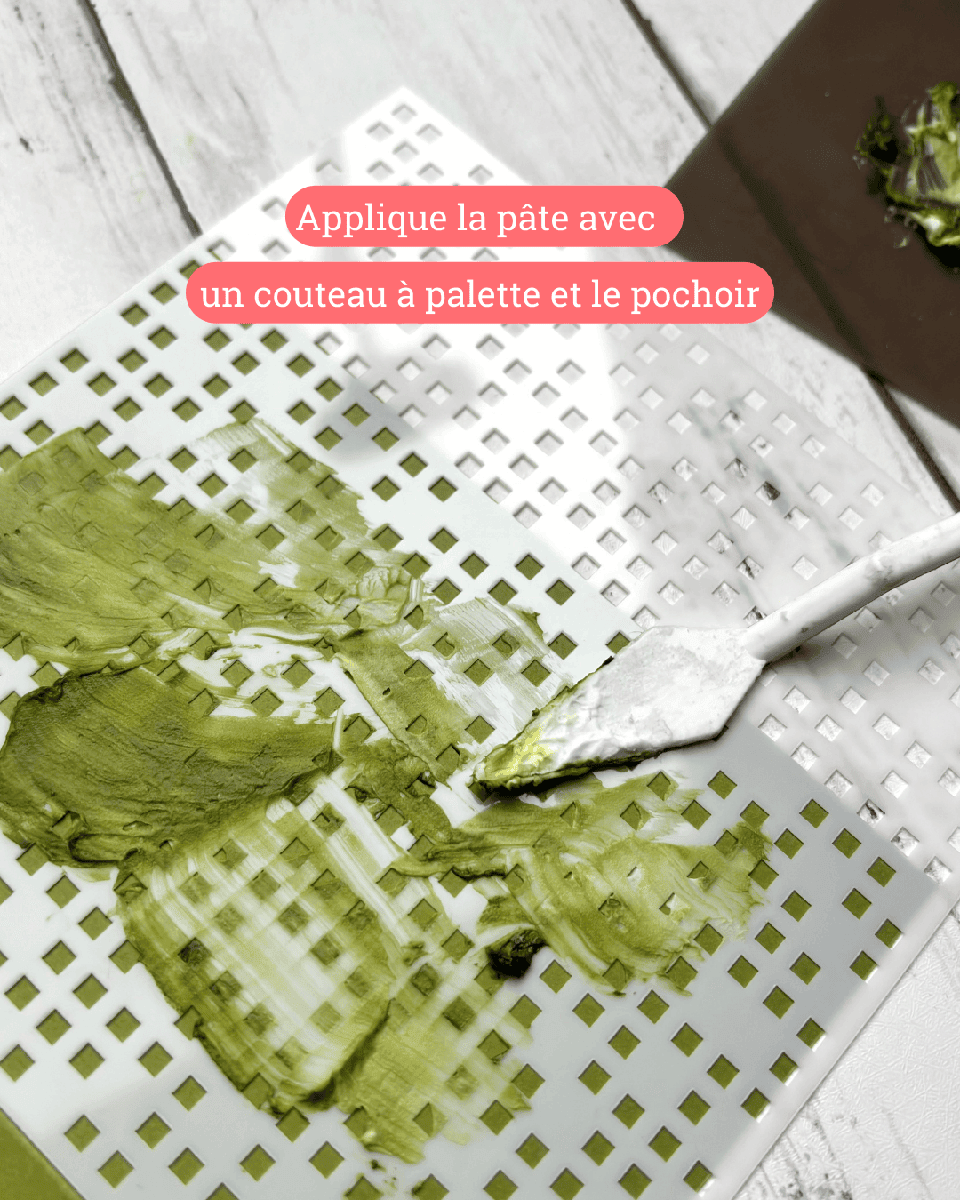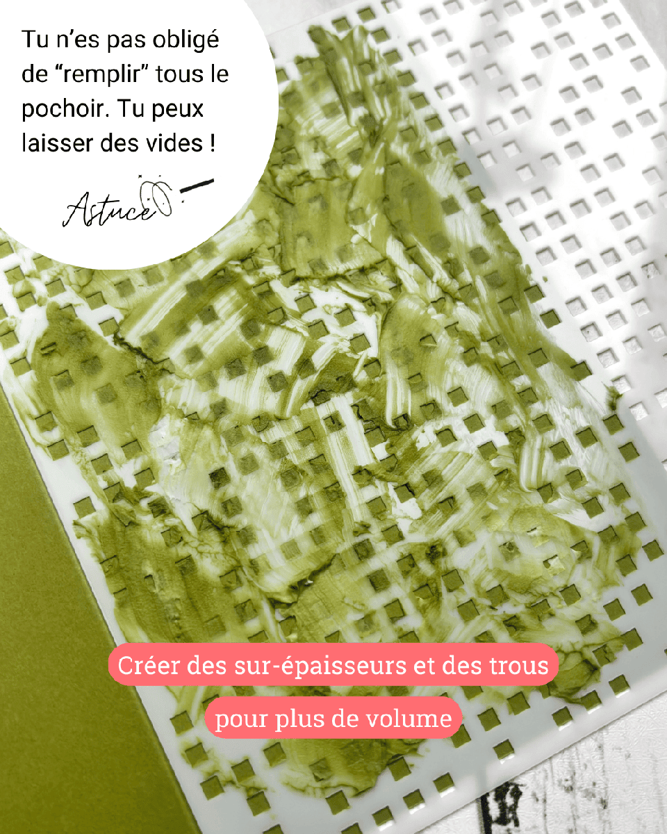Applique-la au travers de pochoirs pour créer des motifs en relief précis et détaillés. Avec la pâte de texture, bouche les trous de ton pochoir. C’est un peu comme de l’enduit mais en plus créatif! Laisse sécher. Tu peux aussi teinter la pâte de texture avec de l’encre liquide avant de l’appliquer.