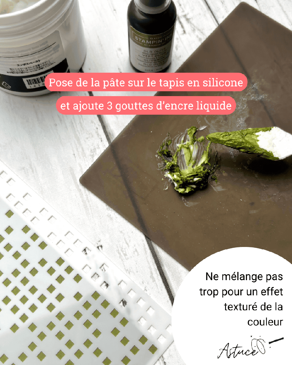 Combine-la avec d’autres produits Stampin’Up! pour ajouter un peu de couleur. Tu peux par exemple ajouter quelques gouttes d’encre liquide. Mélange bien et applique sur ta création.