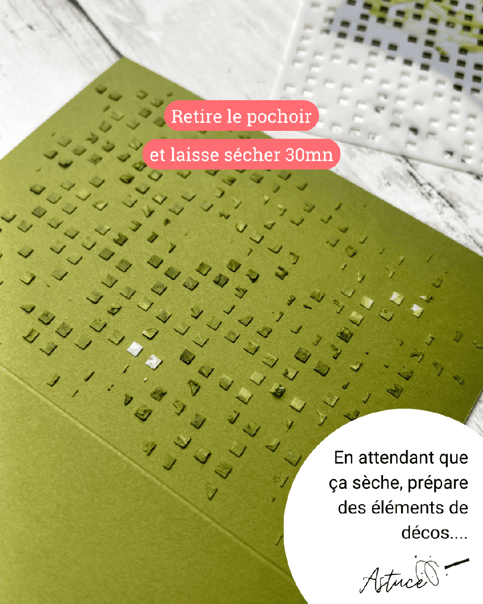 Pour cette carte, je me suis servi des poinçons pour créer un pochoir et faire un motif en relief avec la pâte de texture à paillette.