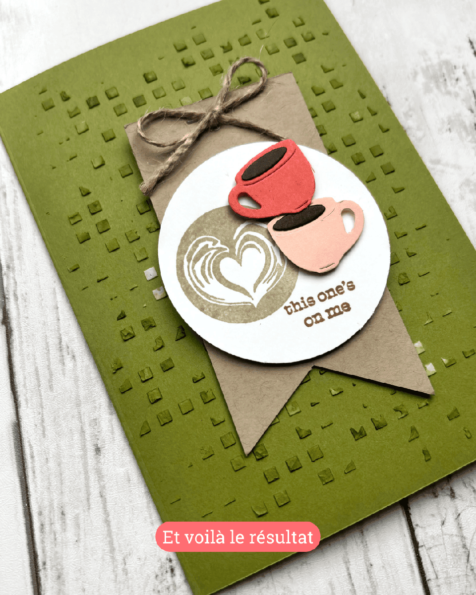 Si tu préfères utiliser les poudres à embosser, suis les étapes suivantes : Applique la pâte à embosser, saupoudre de façon éparse la poudre à embosser cuivrée et chauffe au pistolet. Tu vas apercevoir la poudre cuire sous l’effet de la chaleur et former une croute avec la pâte de texture.