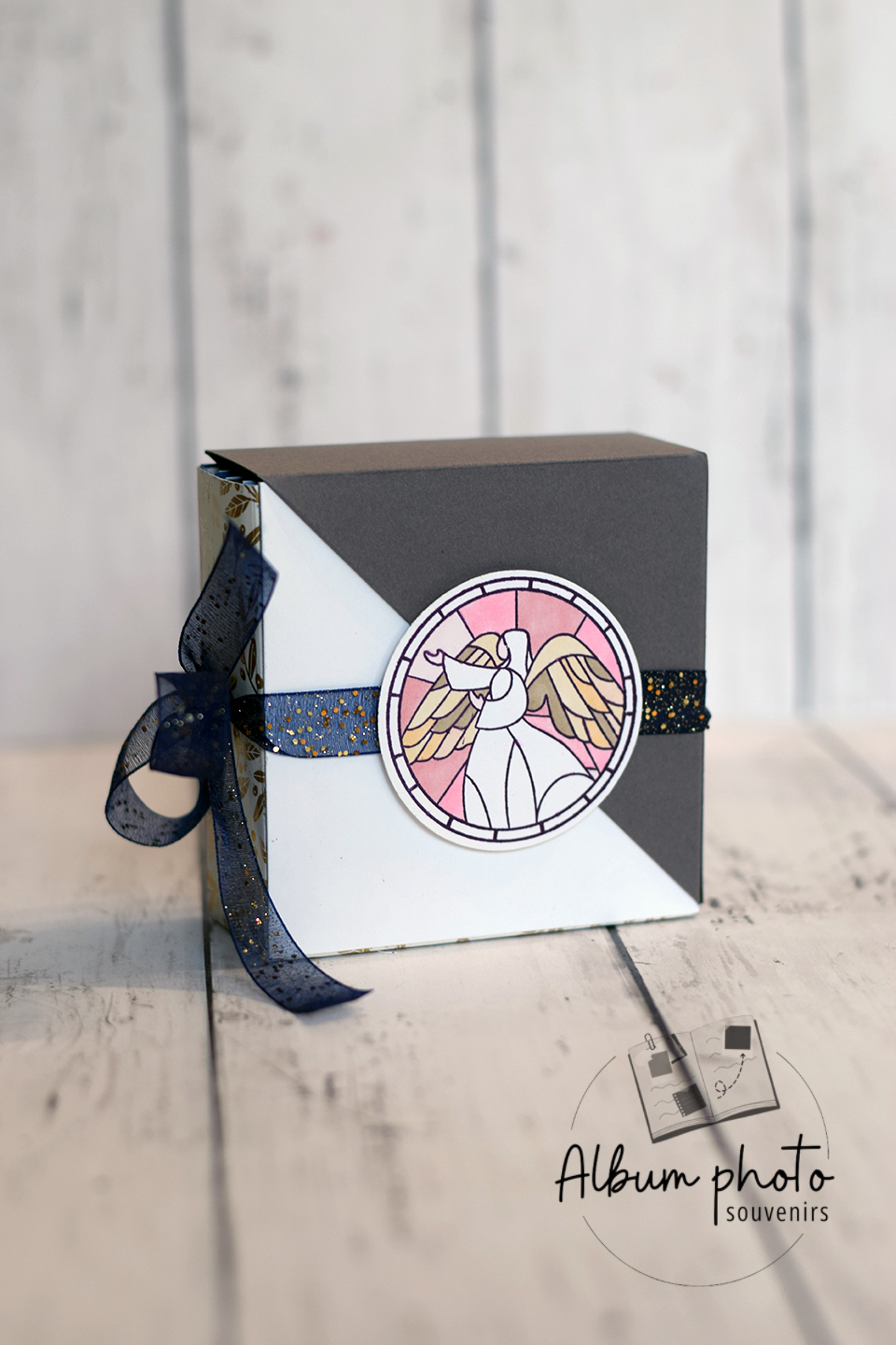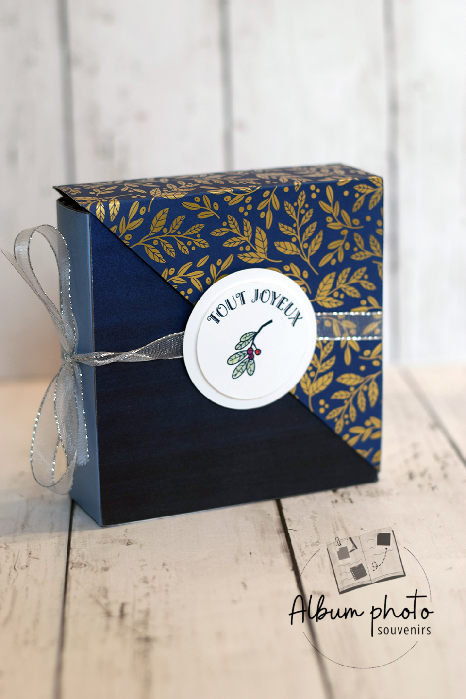 Un album photo carré, bleu nuit et doré, avec un mécanisme unique pour préserver la magie de Noël et des paysages étoilés.