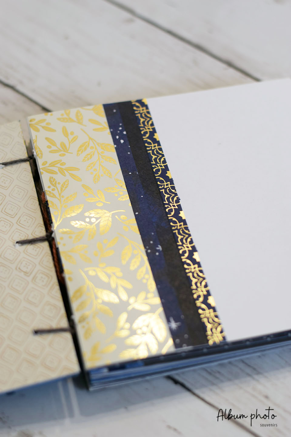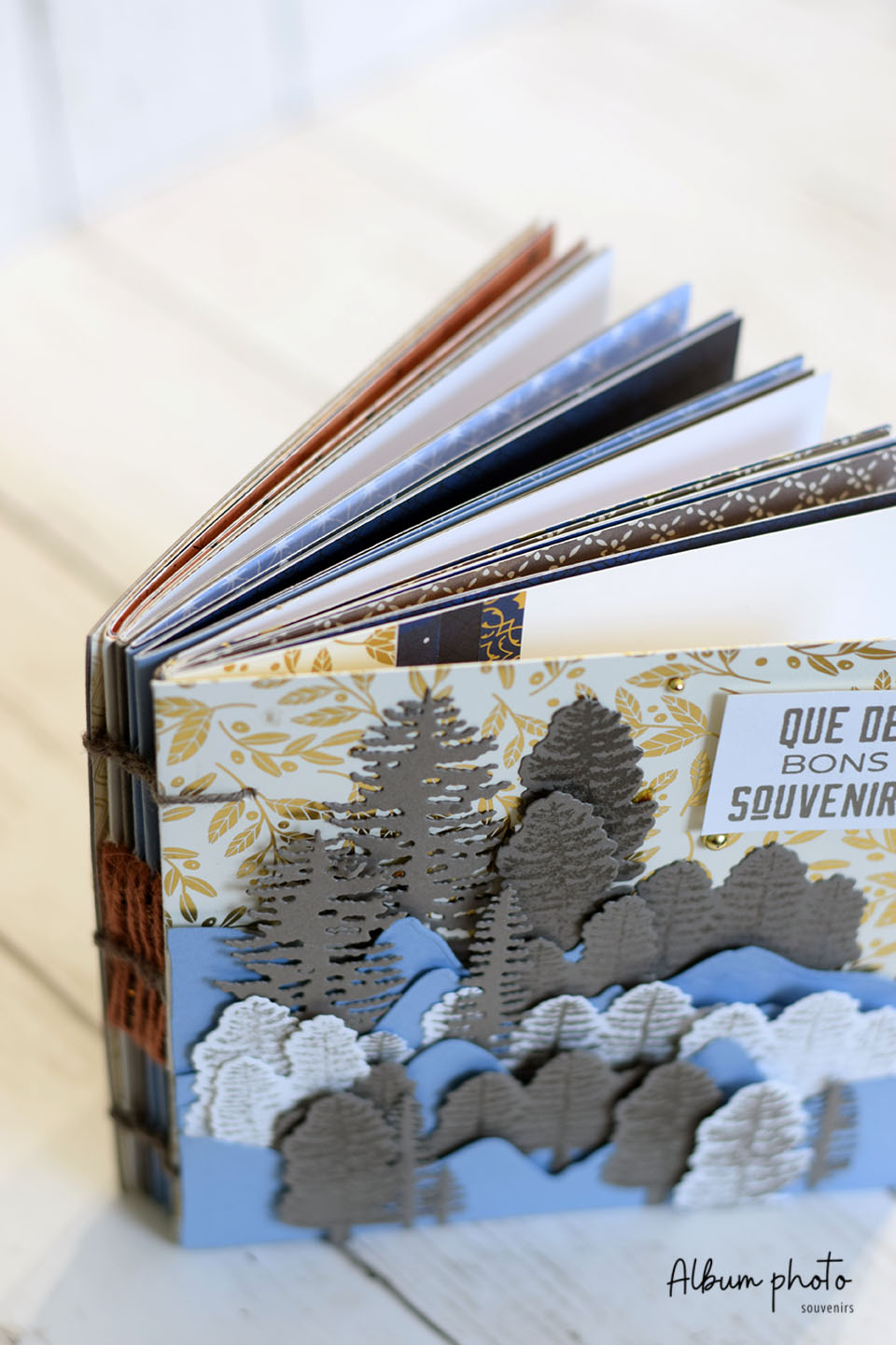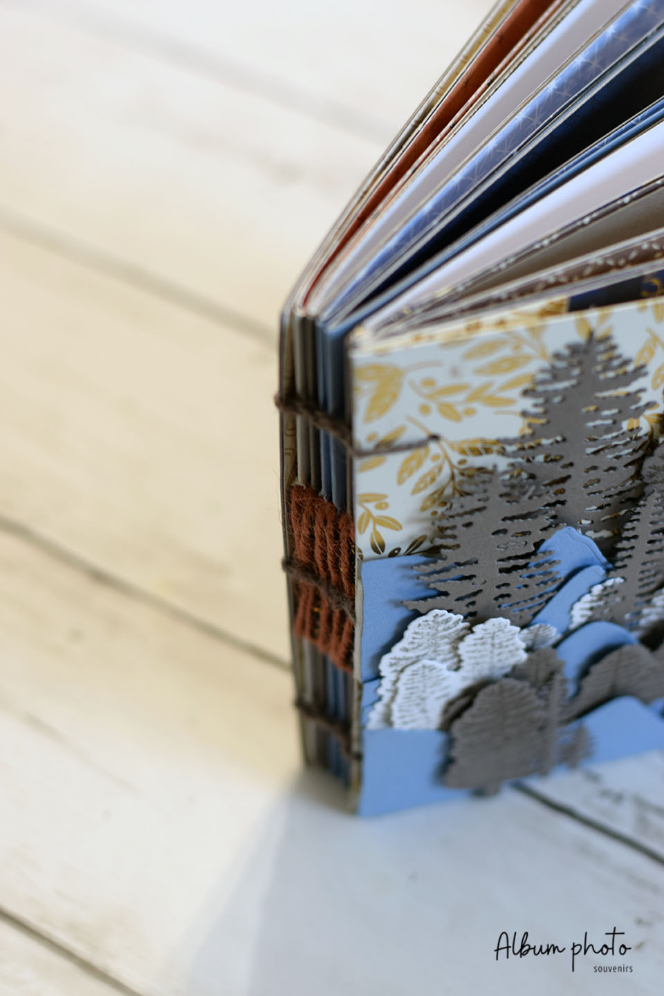 Album de Noël reliure copte cousue avec paysage de montagne et forêt en volume. 38 pages solides aux tons bleu, doré et ocre pour conserver souvenirs d’hiver et moments précieux.