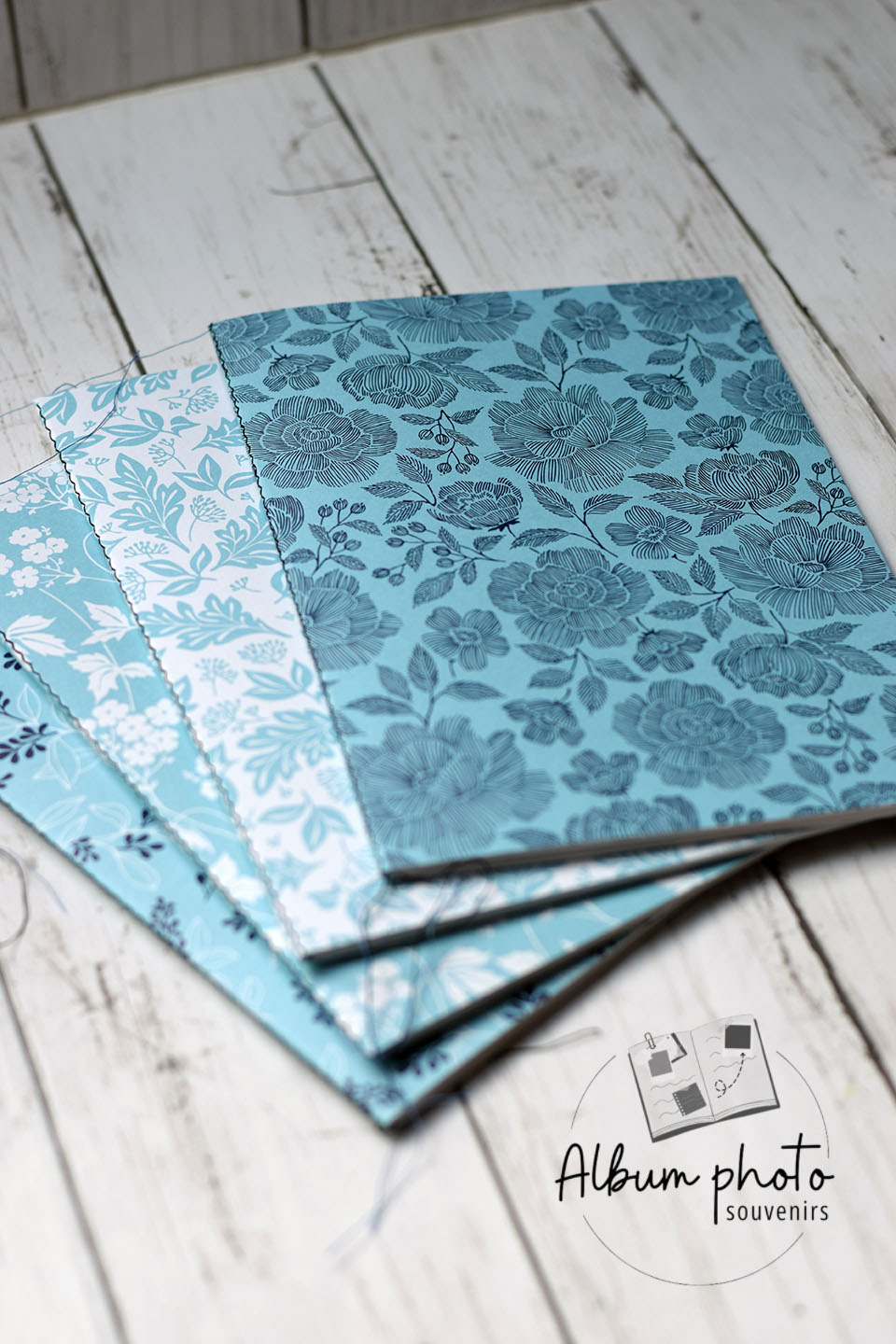 Je te présente ce set de quatre carnets artisanaux format A5, habillés de papiers floraux dans une palette de bleus envoûtants — du bleu ciel délicat au bleu canard profond. Chaque carnet arbore un motif différent, des grandes pivoines graphiques aux petites fleurs sauvages, pour une collection cohérente et tellement esthétique posée sur un bureau ou dans un sac.
