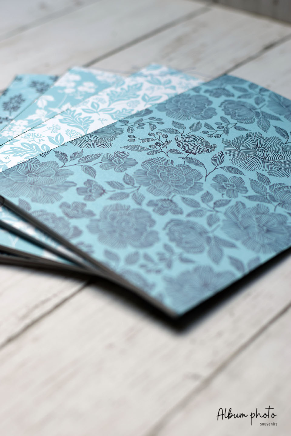 Quatre carnets artisanaux A5 aux motifs floraux bleus coordonnés — pour noter, dessiner et rêver avec style.