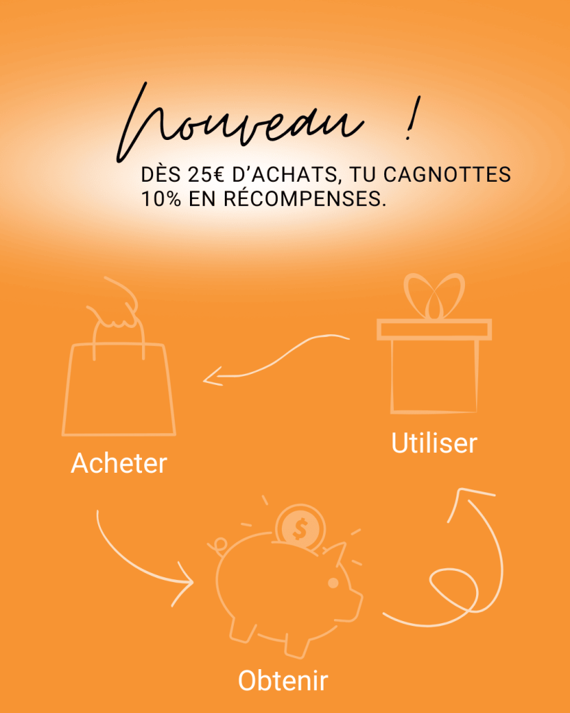 Chez moi, l’expérience de mes clientes est au cœur de mes priorités. C’est pourquoi je suis fière de te proposer un SUPER programme de fidélité. Voici ce que tu gagneras en plus suite à ta commande :
