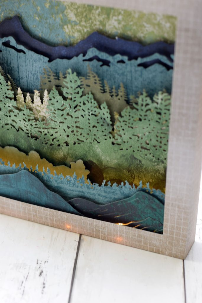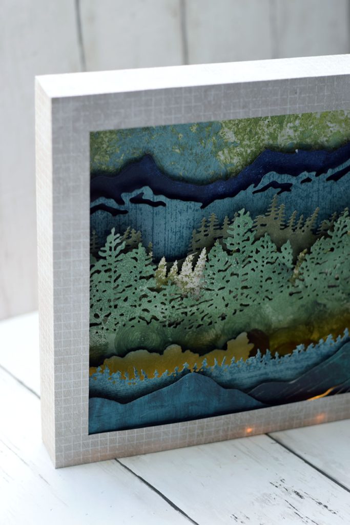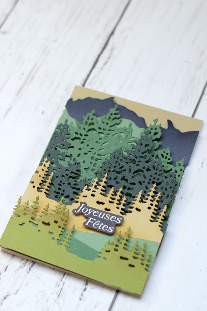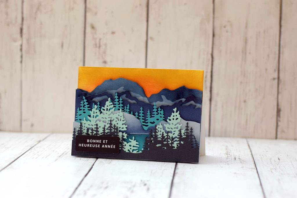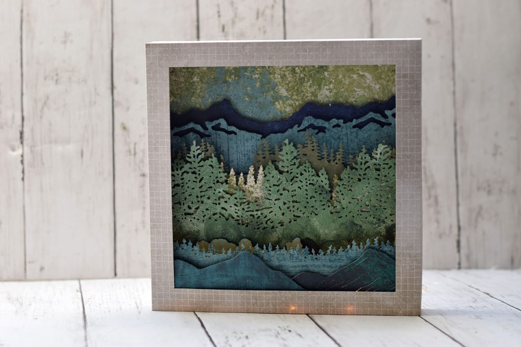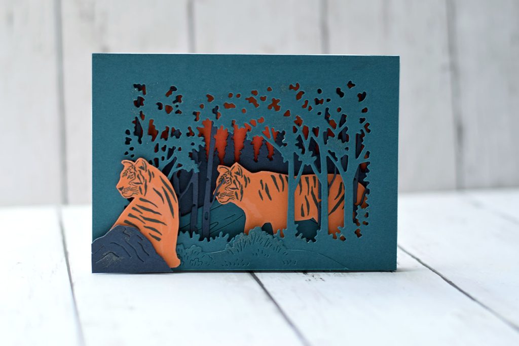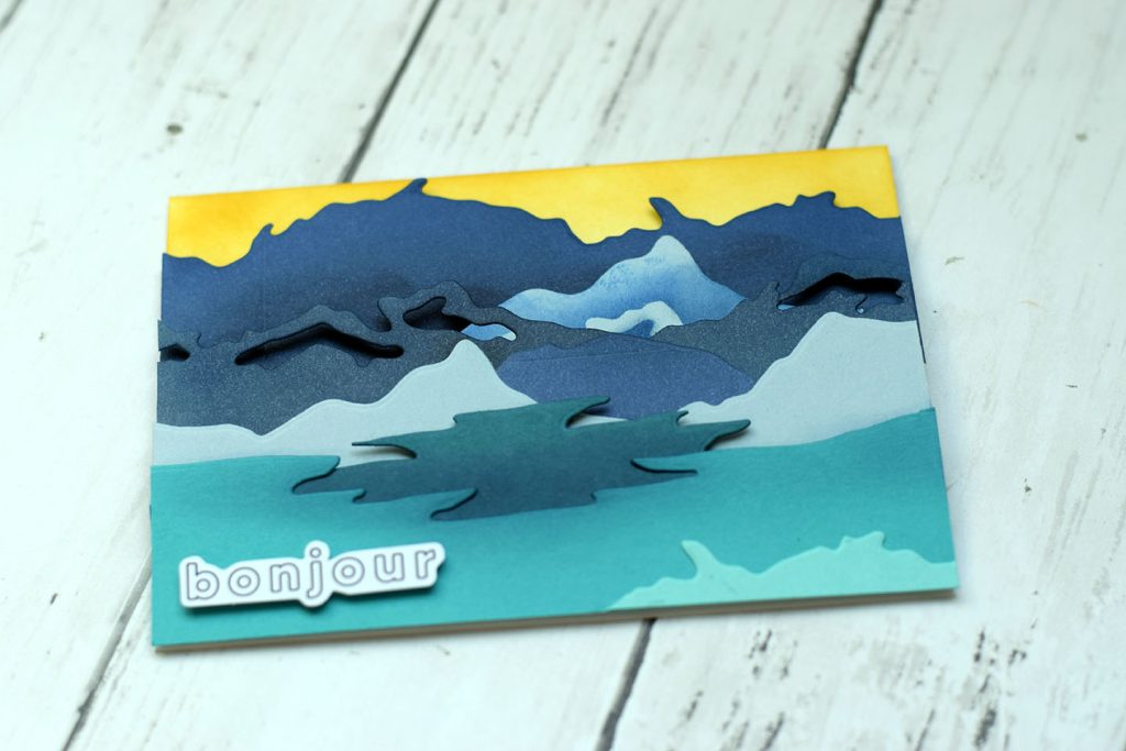 Transforme une simple carte en une scène miniature en relief. Empile les unes sur les autres les couches de papier préalablement découpées avec ta machine de découpe ou ajoute un peu d’interactivité en suivant l’un de mes tutoriels sur les cartes popup.