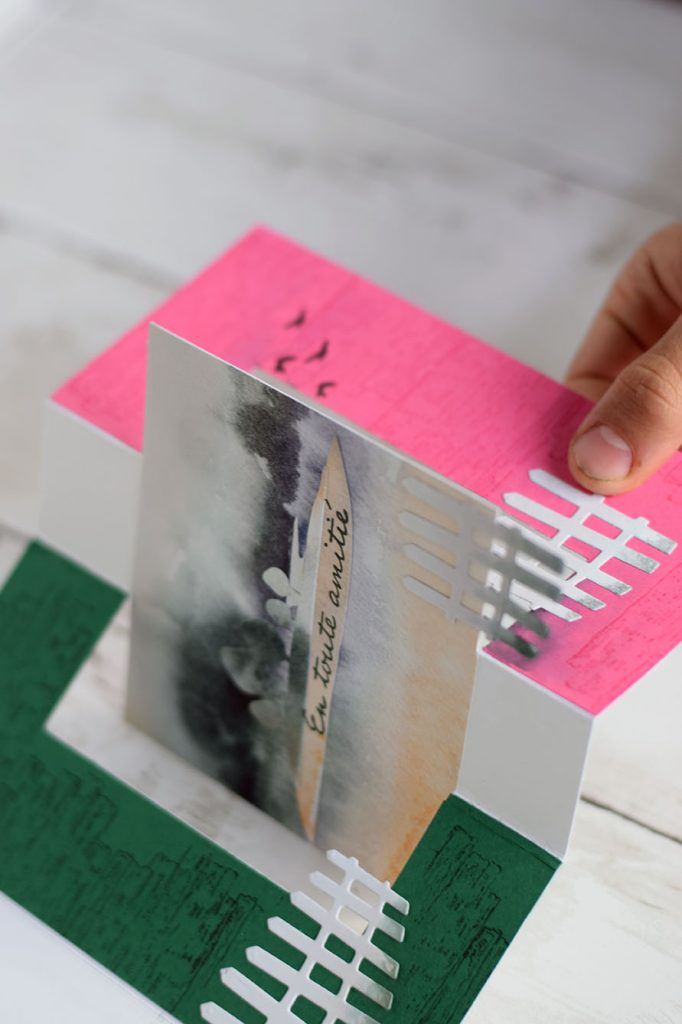 Le mécanisme du flip-flap est très simple à réaliser. Il suffit de créer une petite languette sur le panneau qui tourne. Cette languette sera ensuite collée sur le fond de la carte. Lorsque tu ouvriras la carte, le panneau tournera sur lui-même, révélant ainsi le message caché. Ce mécanisme est parfait pour créer un effet de surprise et d’interactivité.