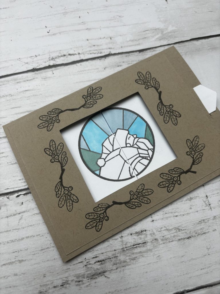 Pour la version avec la chouette j’ai utilisé les tampons « Winter Owls ». L’effet statique et en vol a été vraiment compliqué à créer. Si c’est ta première carte de ce type, je te conseille de choisir un type de motif « nature ou forêt » puisque tu n’auras pas à gérer la jonction entre les 2 décors. L’effet un peu flou rend le travail plus facile.