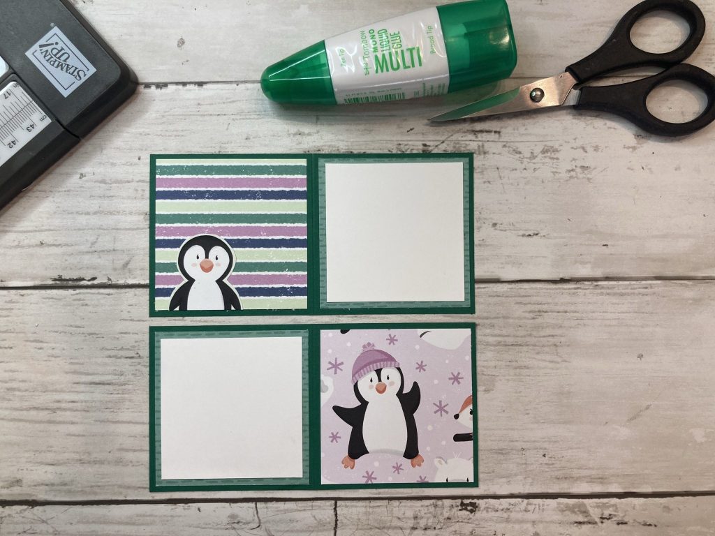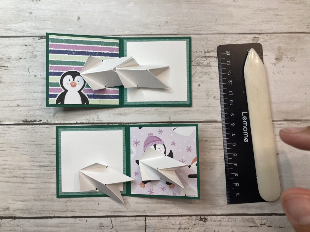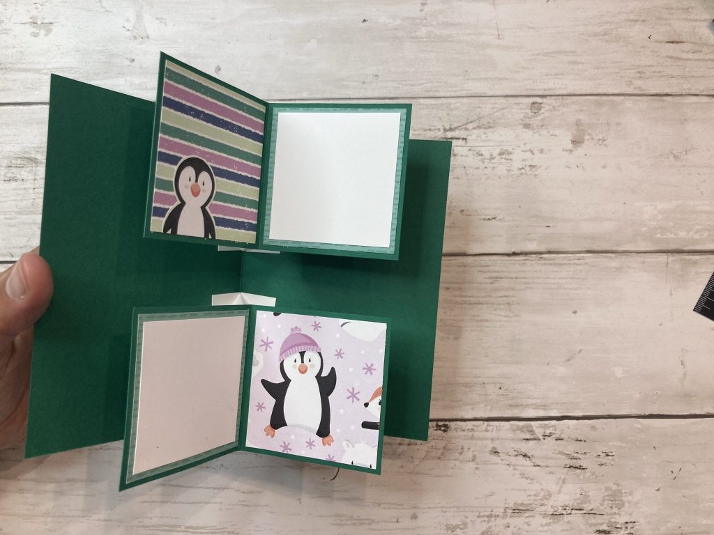 Cette carte est idéal pour un cadeau groupé. Elle offre le double de place pour écrire des petits mots grâce à ces deux plateformes. Voici en image mes versions de cette carte à double plateforme. Lorsque l’on ouvre la carte, les deux panneaux du haut et du bas se déploie pour faire apparaitre le petit mot et des addooooOoraables pingouins !